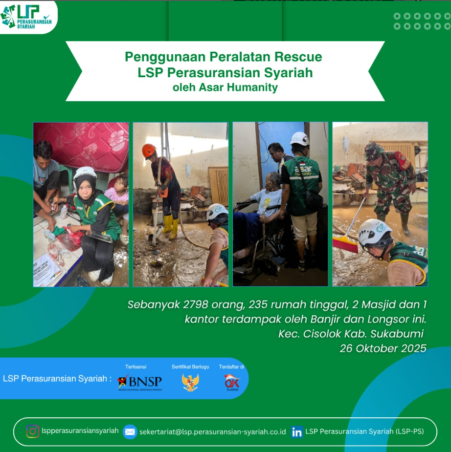 Penggunaan peralatan rescue LSP Perasuransian Syariah (LSP PS) oleh Asar Humanity dalam penanganan banjir bandang dan longsor di beberapa wilayah, di ...