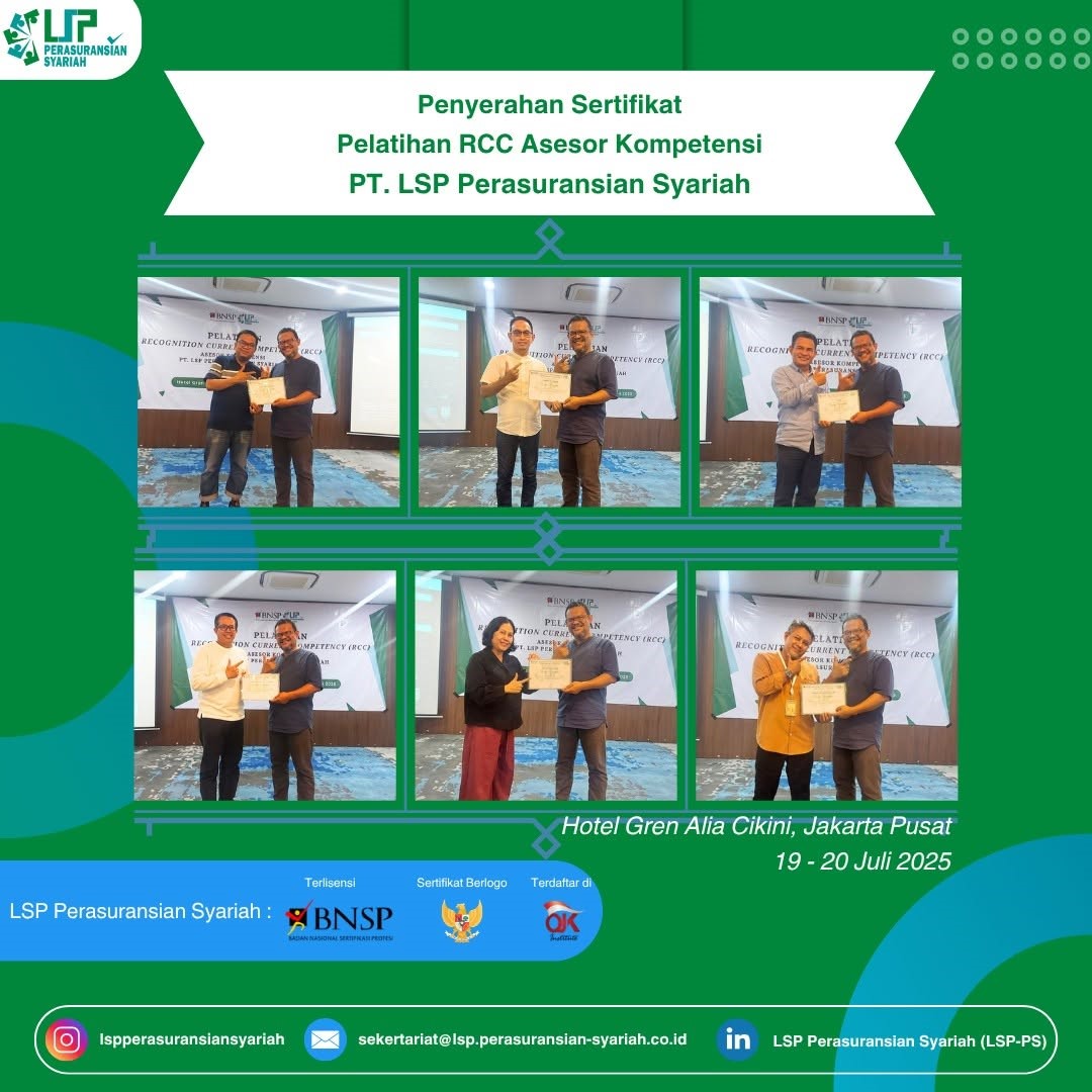 Sesi penutup dari kegiatan Pelatihan Recognition Current Competency (RCC) PT. LSP Perasuransian Syariah ditandai dengan penyerahan sertifikat kepada p...